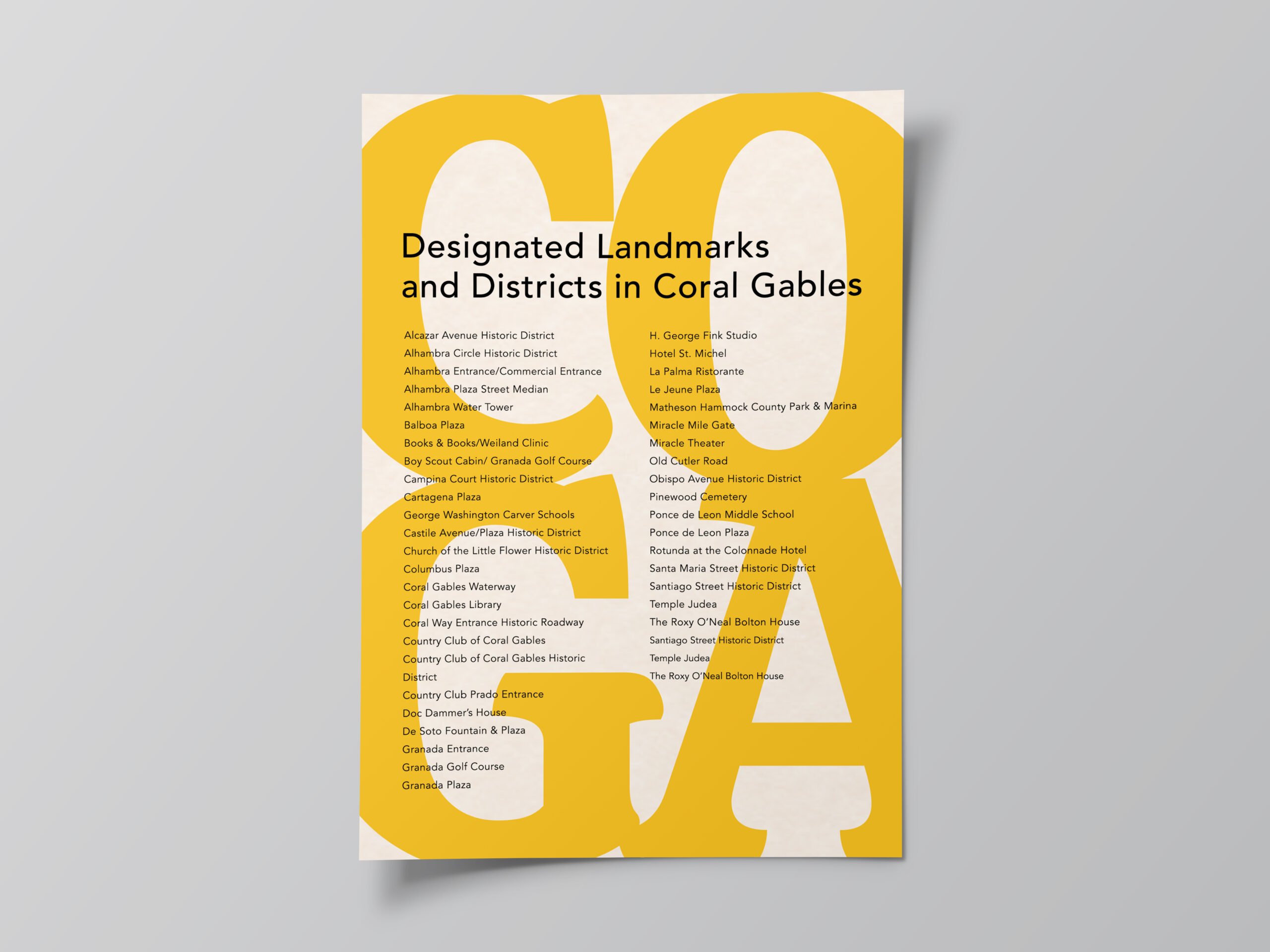 Founded in 1925, the City of Coral Gables boasts a rich architectural legacy shaped between 1921 and 1926 by skilled artisans renowned for their coral rock craftsmanship, inspiring the creation of a striking poster that highlights the city’s iconic landmarks and districts with a fresh, contemporary touch. Featuring minimal design and bold yellow abstract typography, the poster captures attention and draws viewers in from a distance.
